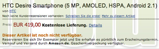D’après Amazon DE, le HTC Desire devrait coûter aux alentours de 419 euros sans forfait. Pour mémoire, le HTC Desire est un modèle très similaire au Nexus One, et même meilleur sur certains points. On sait aujourd’hui que le HTC Desire ne sera pas vendu en exclusivité, et devrait même sortir chez plusieurs opérateurs en plus de nos marchands. A 419 euros sans forfait, subventionné par un opérateur il pourrait tomber logiquement autour des 50/100 euros. Une très belle affaire !