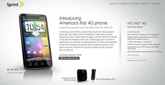 Nous l’annoncions la semaine dernière et il fut bel et bien de sortie lors du salon CTIA : Le HTC EVO (Supersonic) vient d’être présenté. Il s’agit d’un des premiers androphones compatibles 4G (EV-DO / WiMAX), avec sortie HDMI et encodage/décodage en 720p, un écran 4,3 pouces, du Snapdragon 1 Ghz, 1 Go de mémoire RAM, une caméra de 8 mégapixels à l’arrière et de 1,3 mégapixels en façade pour faire de la visio-conférence grâce à Qik, Android 2.1 avec interface HTC Sense, possibilité de s’en servir comme hotspot. Prévu pour le moment chez Sprint (USA), il ne débarquera pas en France lorsque… en tout cas pas de si tôt ni ce modèle précis (on parle de réseau CDMA 3G / EV-DO non compatible avec les réseaux français). Par contre des modèles assez proches pourraient très bien proposés…