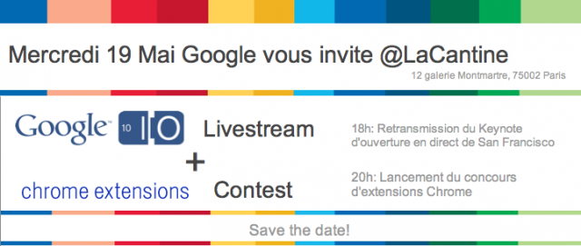 Mercredi 19 Mai: livestream Google I/O + lancement concours extension chrome + petite formation extension chrome + talks (sur les annonces) + de quoi passer une agréable soirée (pizzas…). Le programme définitif arrive sous peu. En attendant dépêchez-vous de remplir le formulaire, les places s’envolent vite.