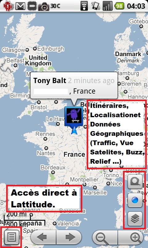 La nouvelle amélioration de Google Maps permet d’avoir des onglets pour qu’on puisse accéder à l’information que l’on souhaite beaucoup plus facilement, juste en tapant sur les nouveaux boutons que l’on peut voir en bas à droite de la carte pour obtenir des indications et tout un tas d’autres options bien sympathique, n’oublions pas de nous rendre dans les paramètres du Google Labs pour activer ces autres options présentes.