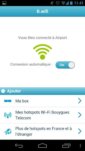 B.wifi vous connectera facilement aux réseaux Wi-Fi disponibles :- Chez vous, soyez connecté réseau Wi-Fi de votre box.- En mobilité, ouvrez B.wifi pour être connecté aux hotspots WiFi Bouygues Telecom présents autour de vous, sans avoir à saisir votre identifiant et votre mot de passe à chaque fois.- Partout dans...