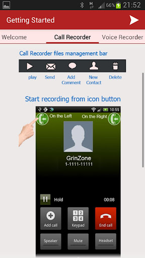 Pas encore disponible en français, InCall Recorder reste dans la forme très facile d'utilisation avec des fonctions intuitives même pour un non-anglophone. elle est simple et offre une très bonne qualité d'enregistrement des appels qui peuvent être enregistrés manuellement ou automatiquement, le mode automatique ne fonctionnant uniquement pour les contacts pré-configurés. En plus d'être un enregistreur vocale, MP3 InCall Recorder & Voice peut également faire office de dictaphone.